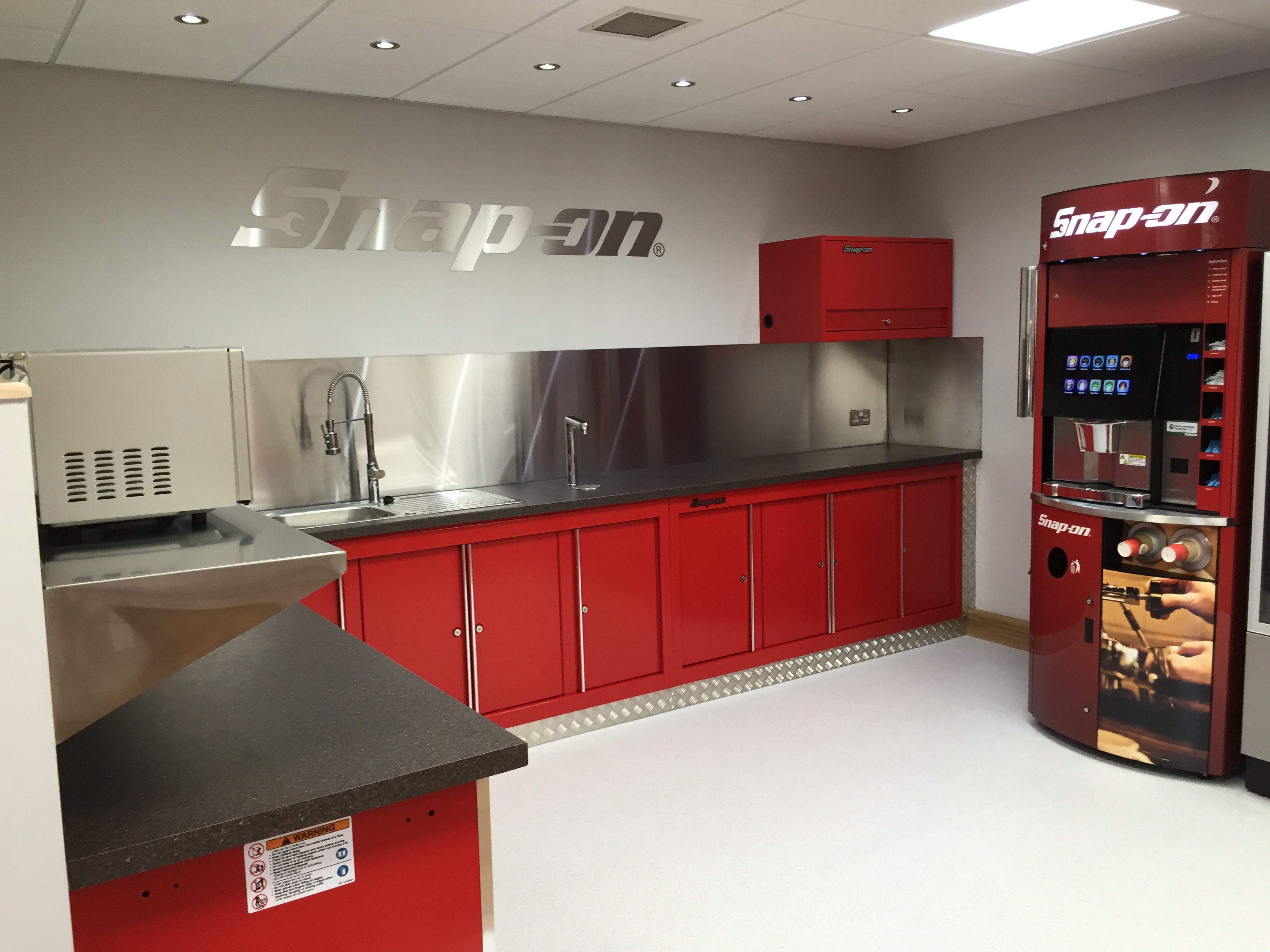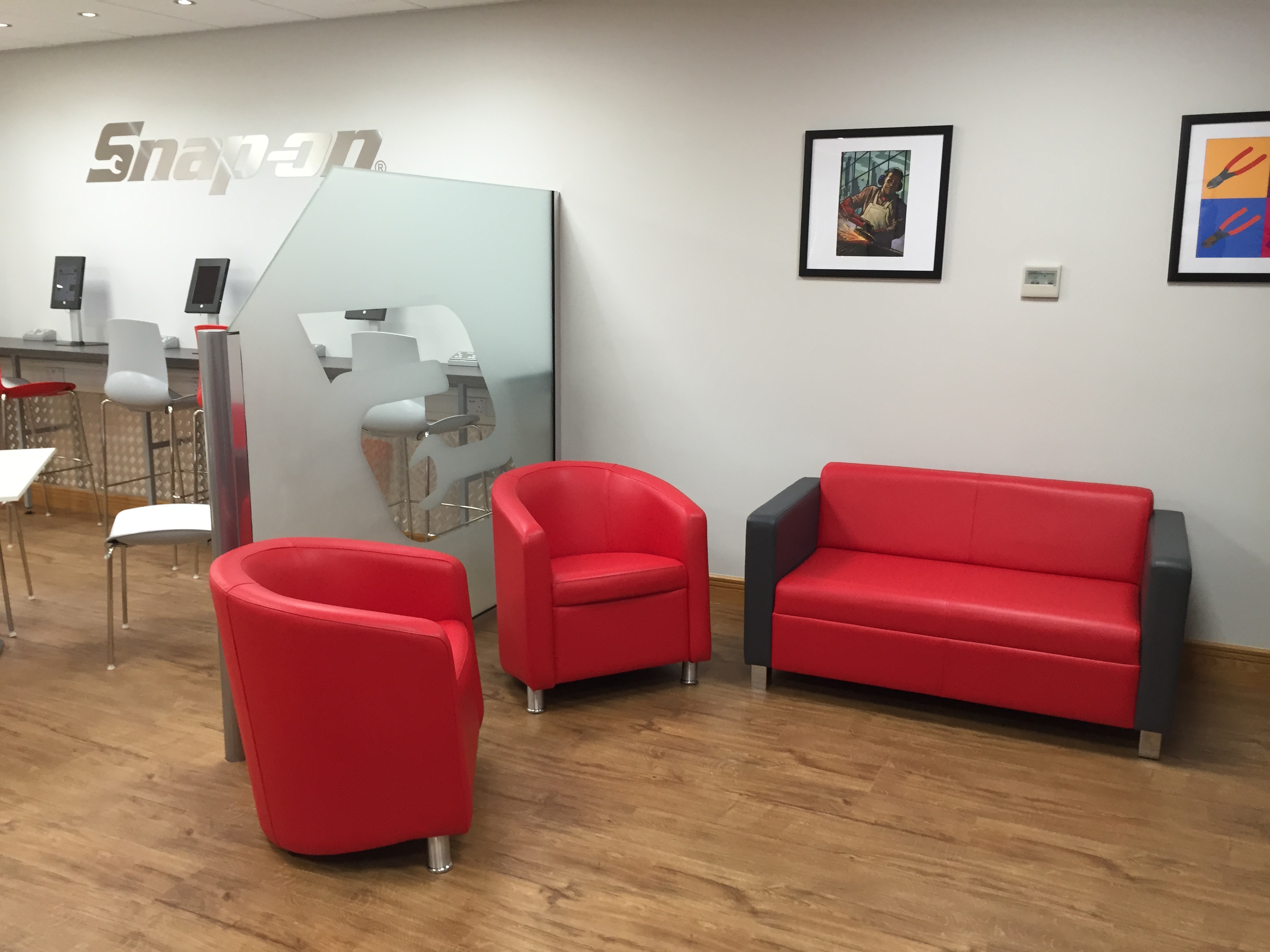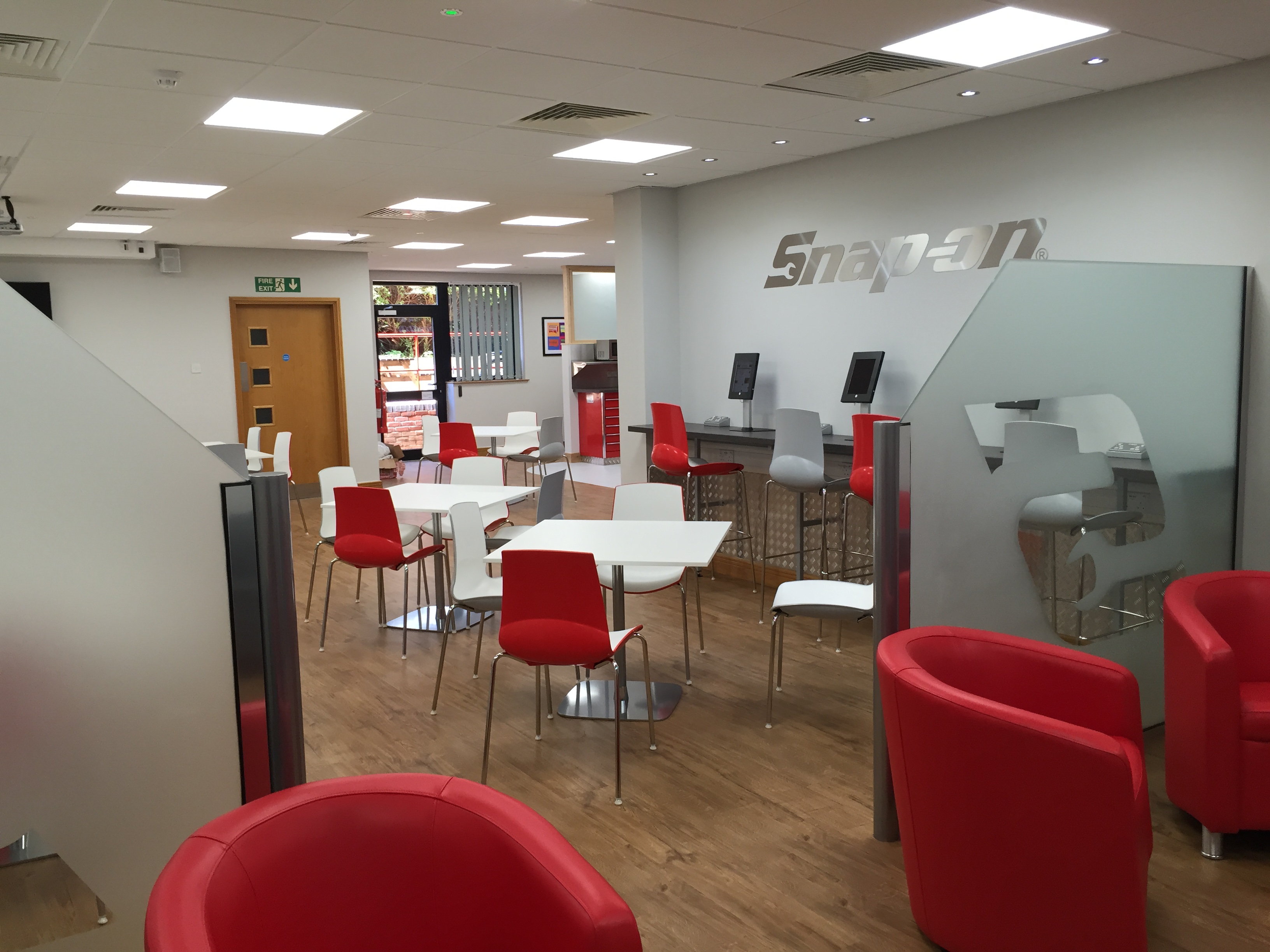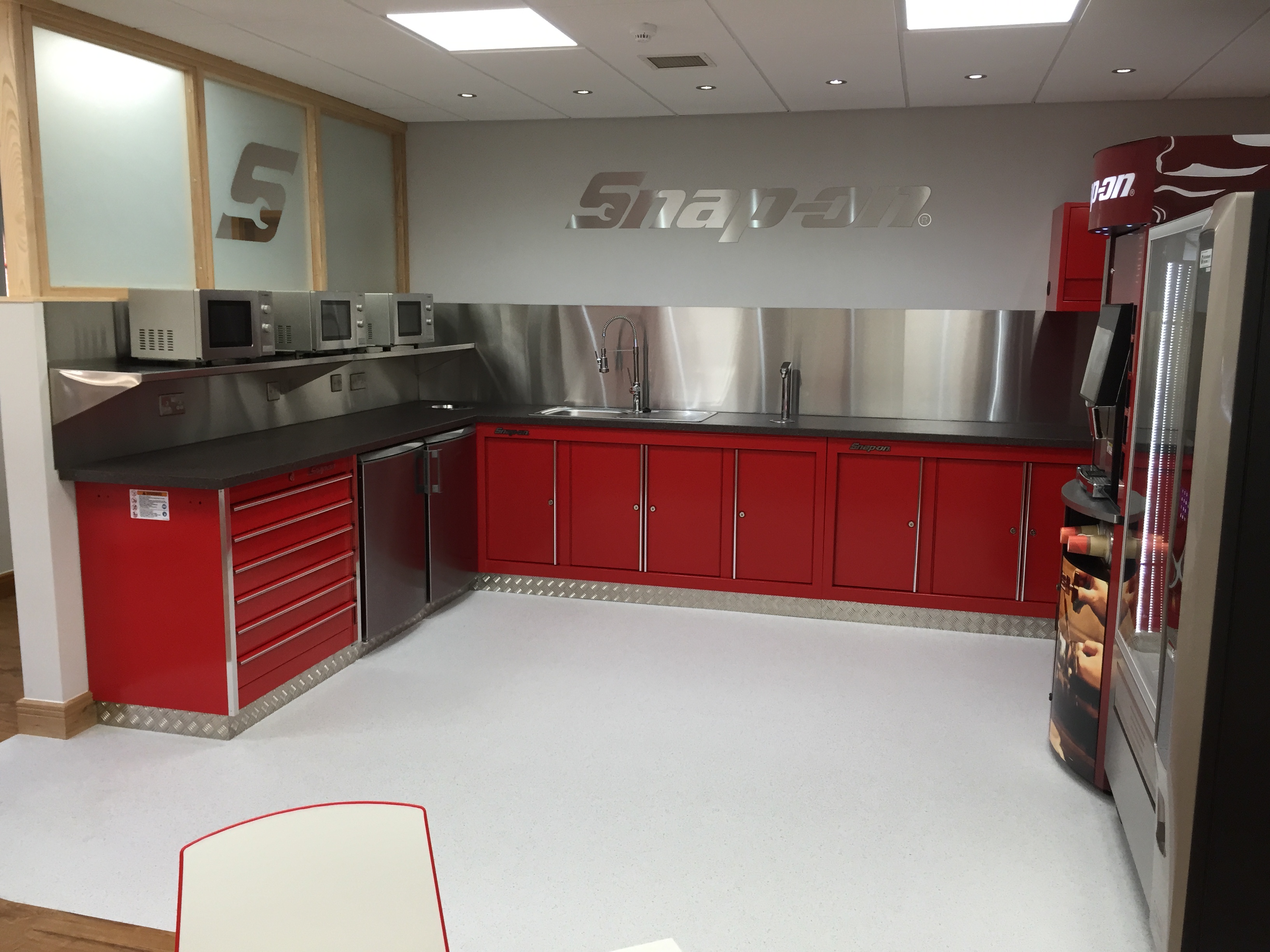A long standing client, Snap On Tools invited us to get involved in the redesign of their staff canteen and breakout area. We did the initial designs, and the client had an existing interior fit out contractor do the building works. We then installed all the furniture to create a stunning area that reflected the brand. The main contractor did a beautiful job of the interior works, and even used tool boxes to create a kitchen area – which was a great idea.