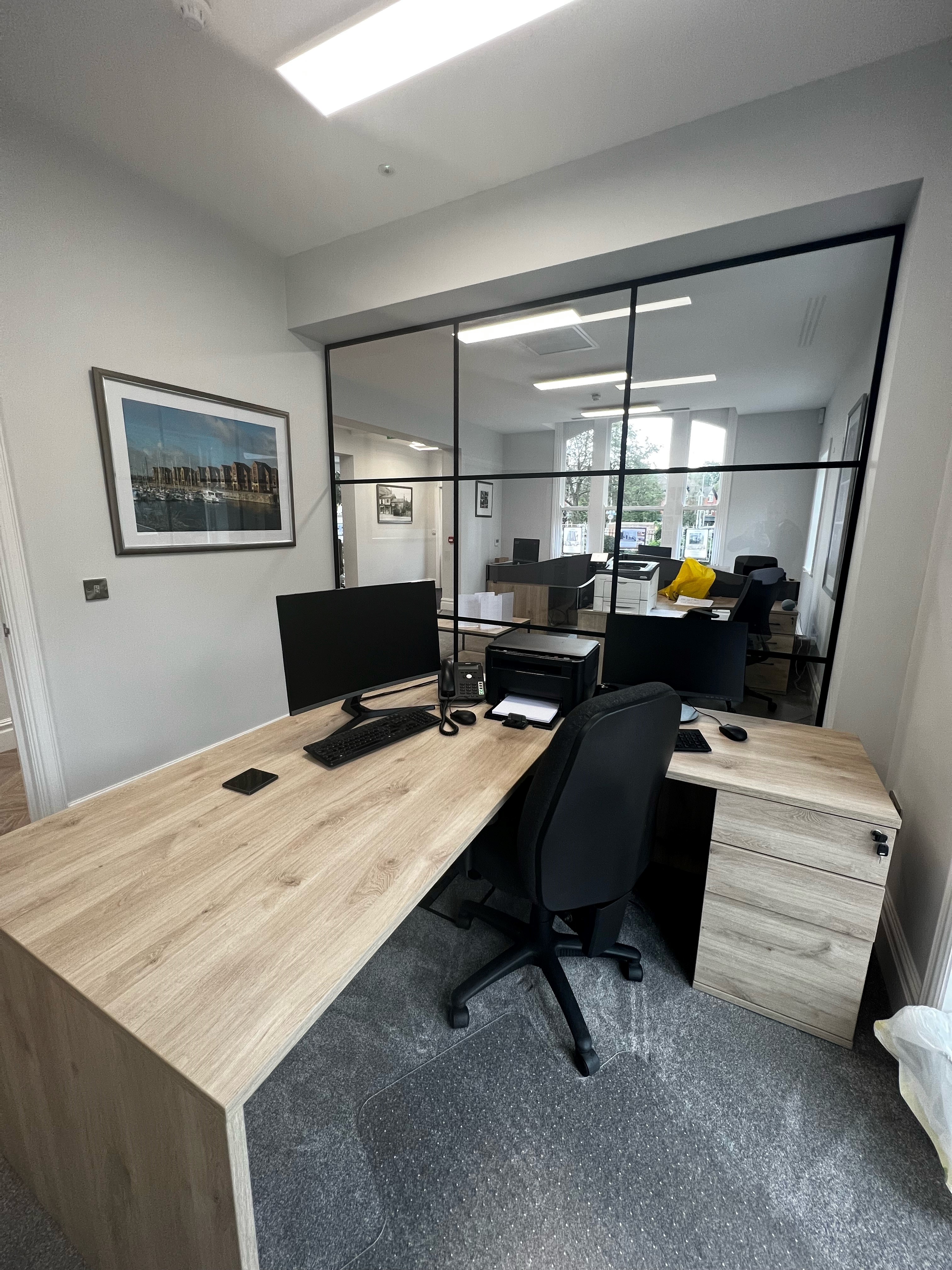 The project included partitioned glass walls, furniture and reception desk.